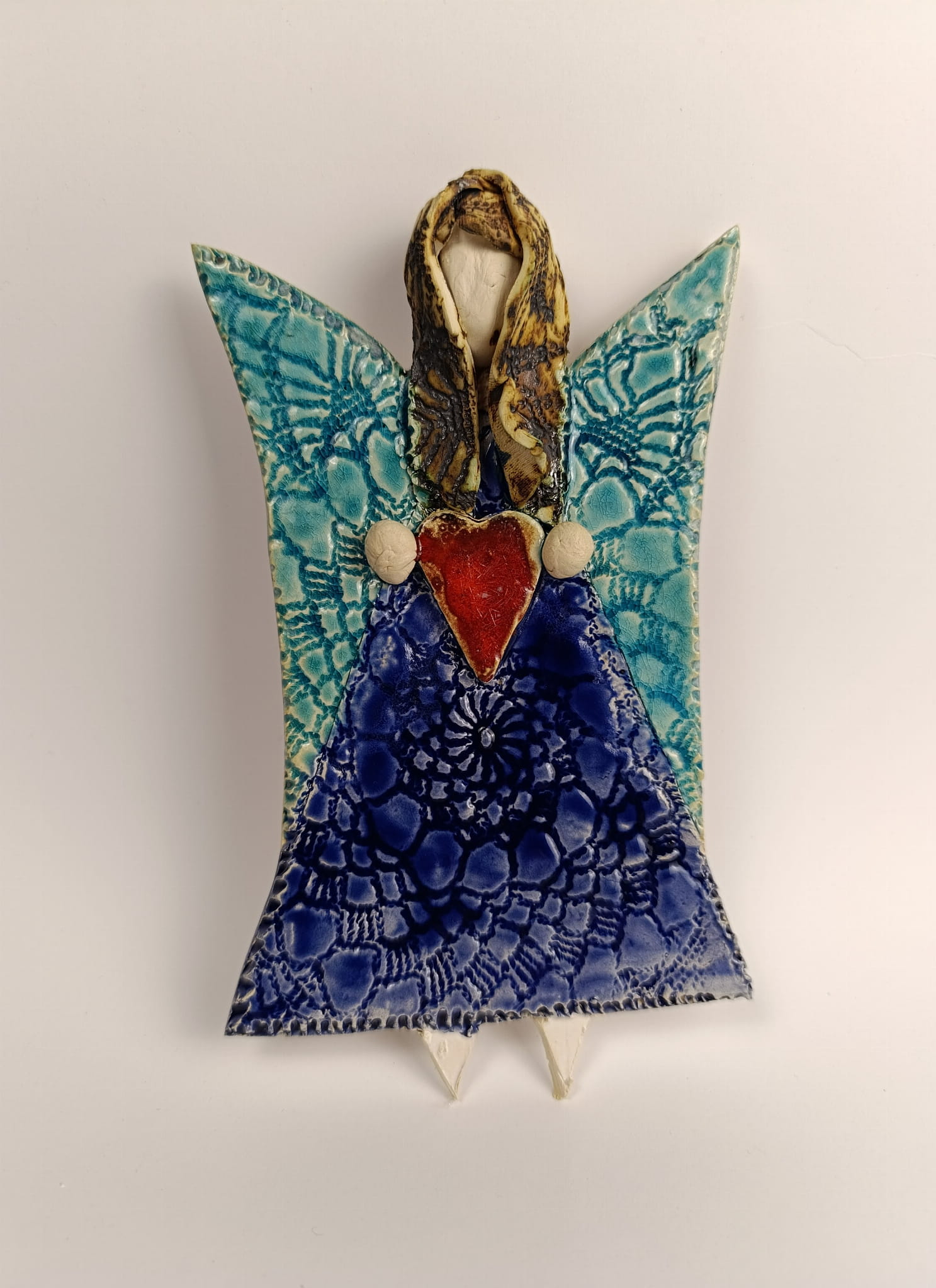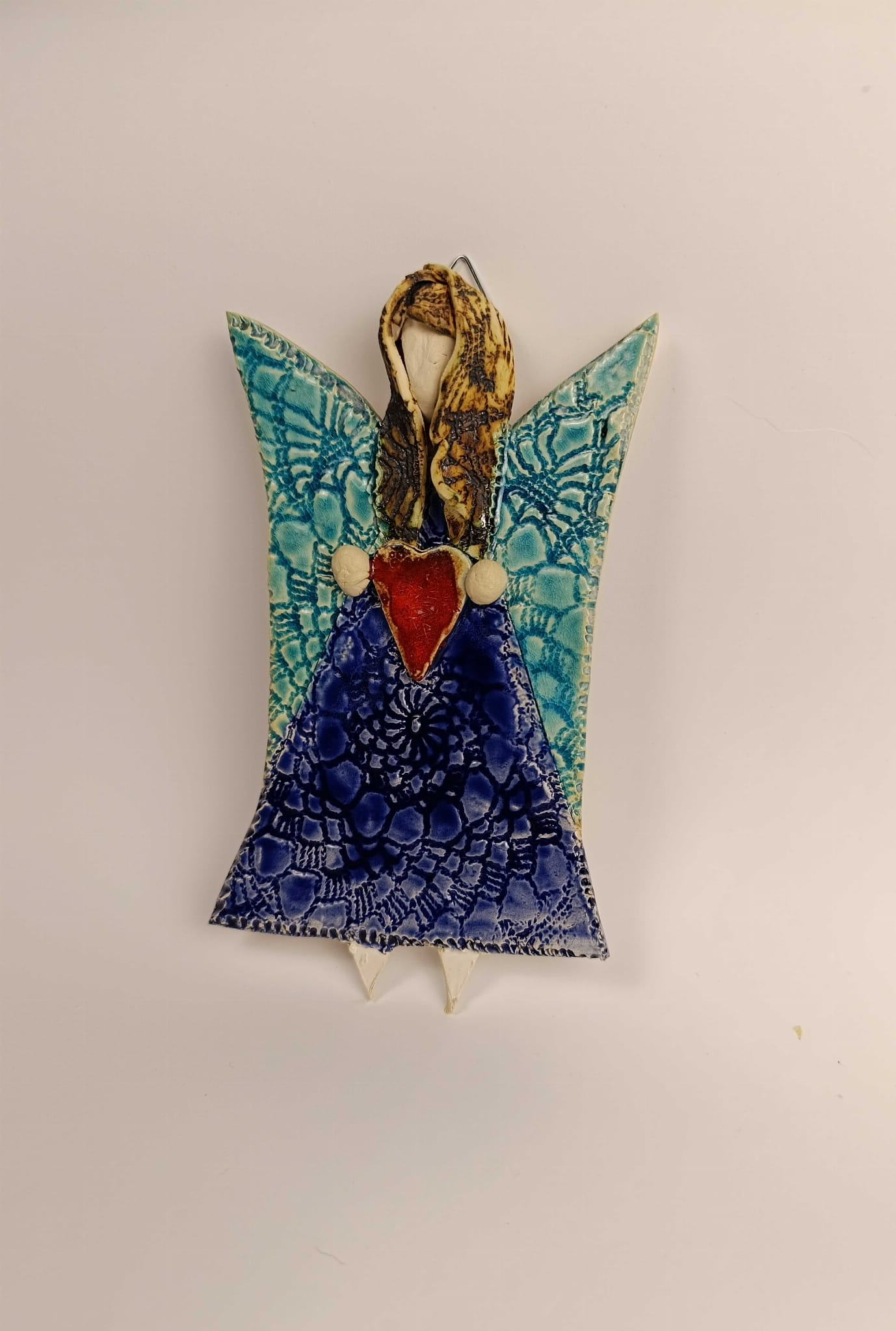 Anioł ceramiczny przygotowany do zawieszenia na ścianę.