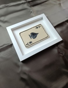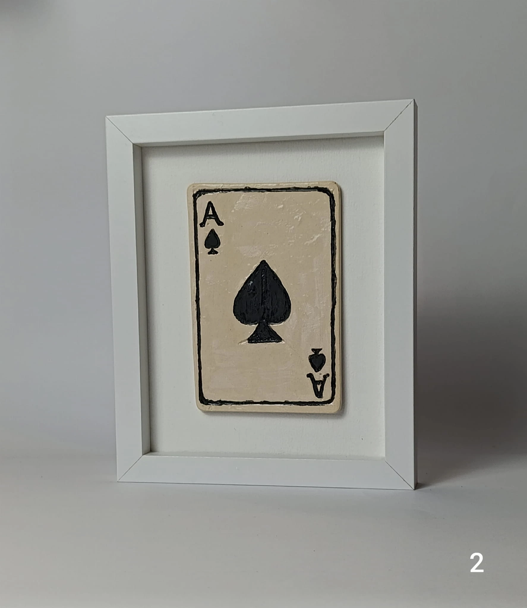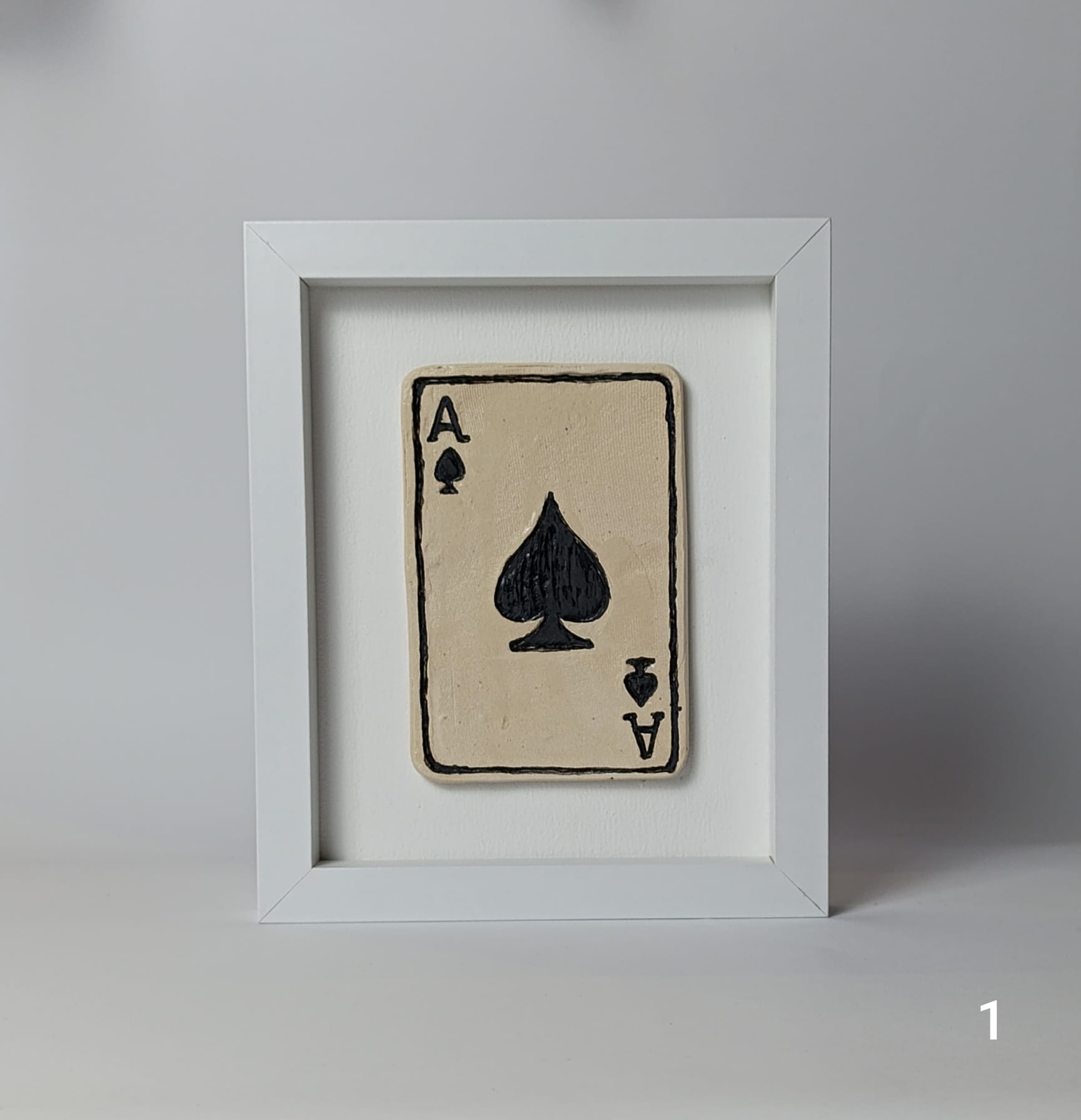Karta Ceramiczna As przytwierdzona jest do drewnianego podłoża, oprawiona jest w białą ramkę, wymiary zewnętrzne ramki wynoszą ok. 20cm x24cm.