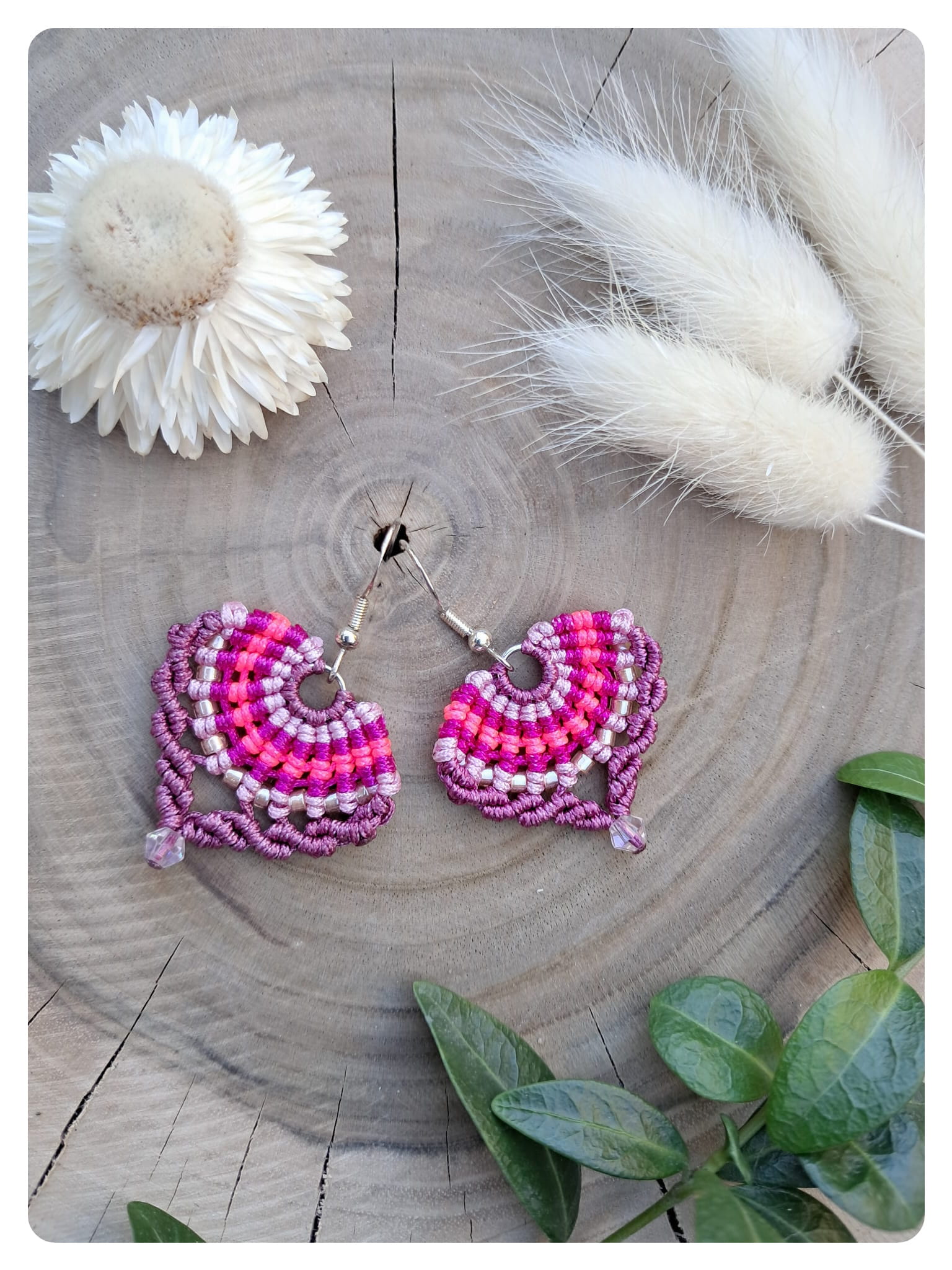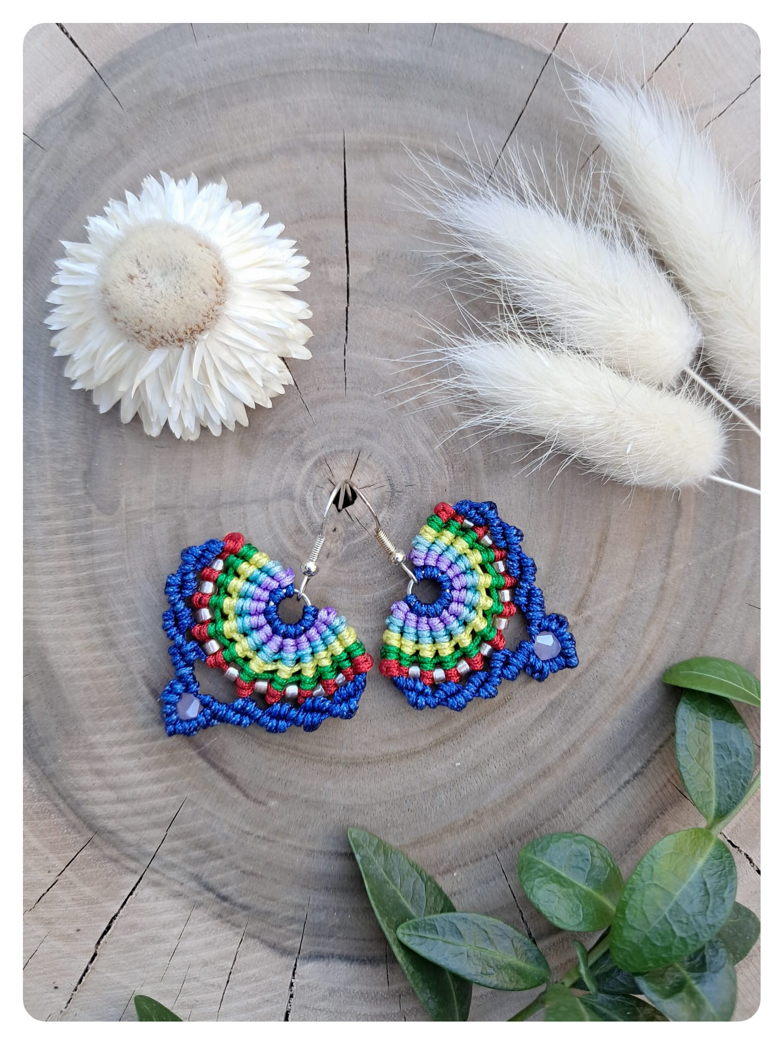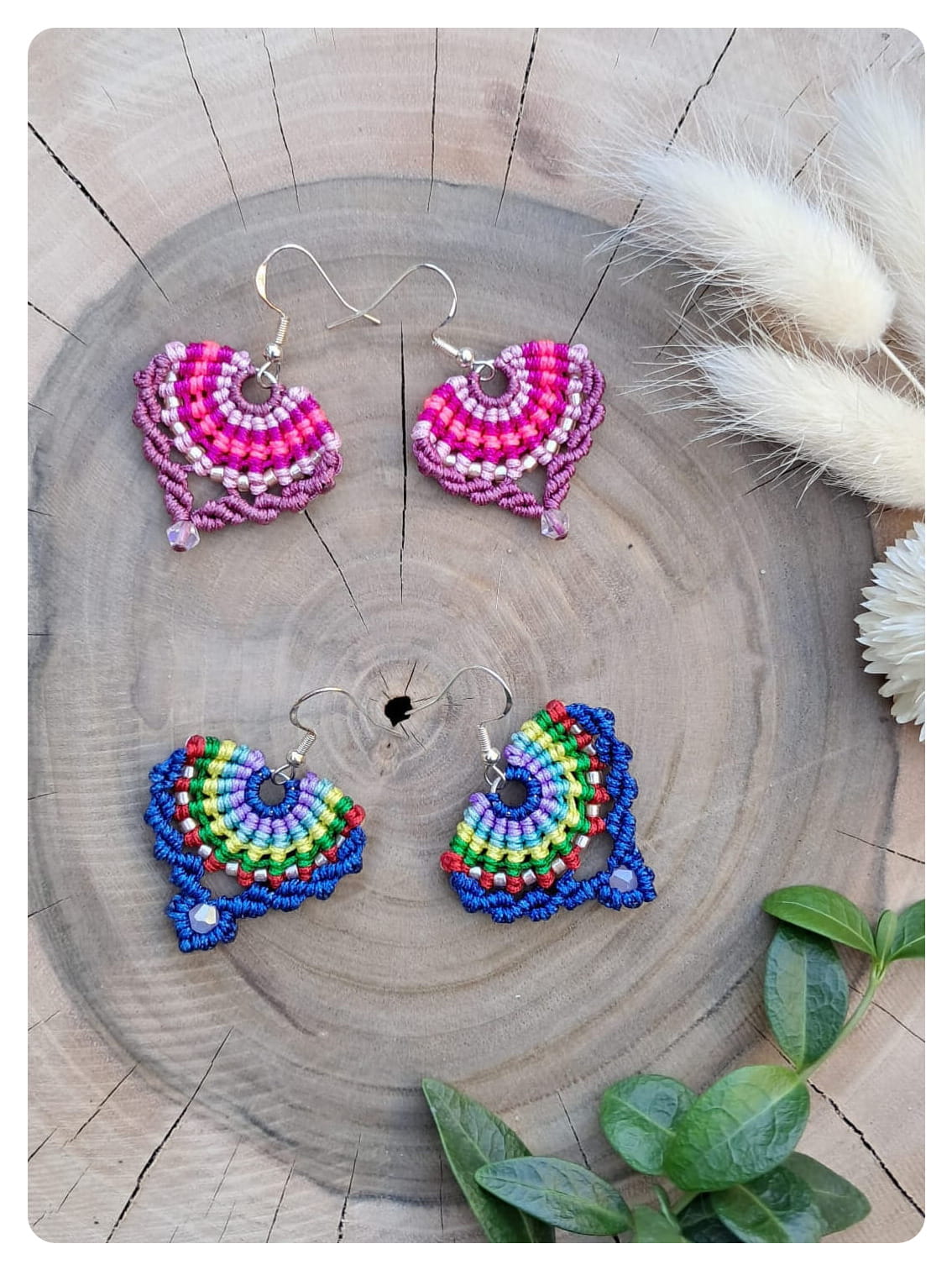 Ręcznie wykonane kolczyki w technice mikromakramy to prawdziwa feeria barw i radości. Każda para została starannie zapleciona z wielobarwnych nici, tworząc wzór przypominający wachlarz lub półksiężyc.