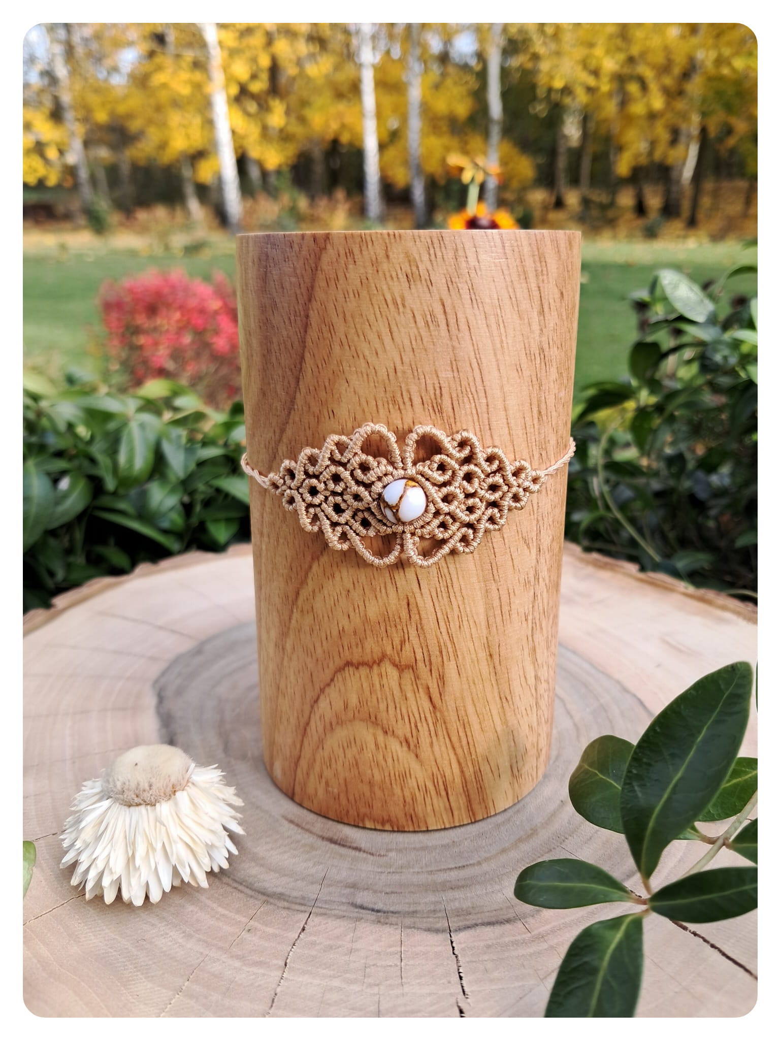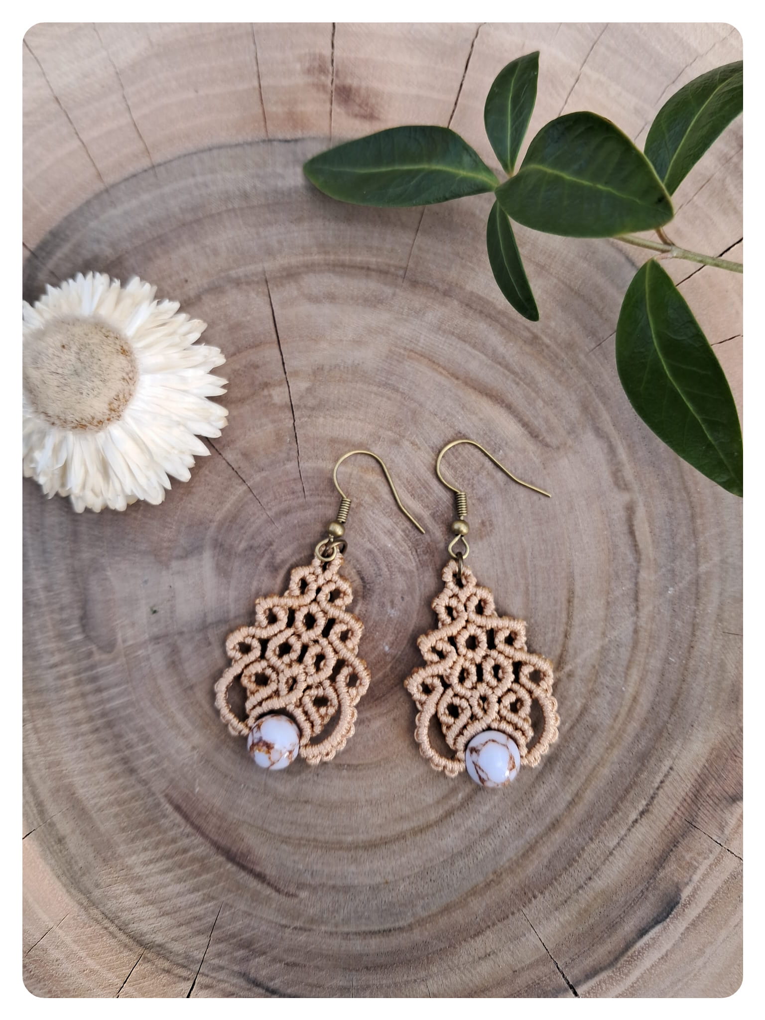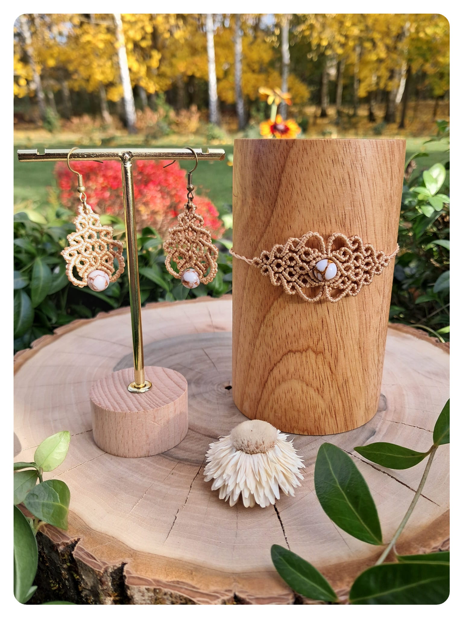 Wyjątkowa biżuteria inspirowana naturą. Ten elegancki komplet składa się z kolczyków oraz bransoletki, wykonanych techniką mikromakramy w kolorze kremowym, ozdobionej naturalnym białym howiltem ze złotymi żyłkami.