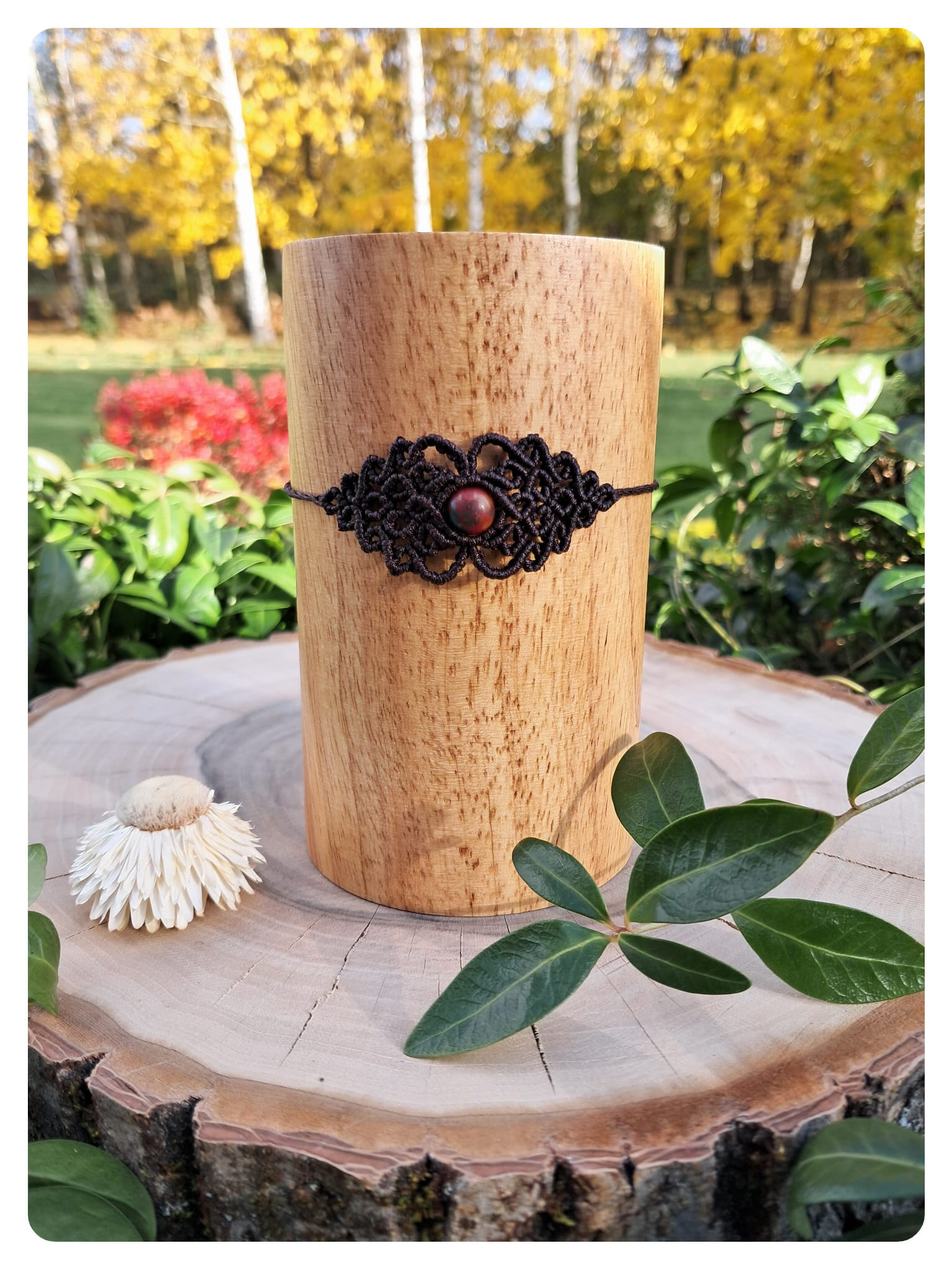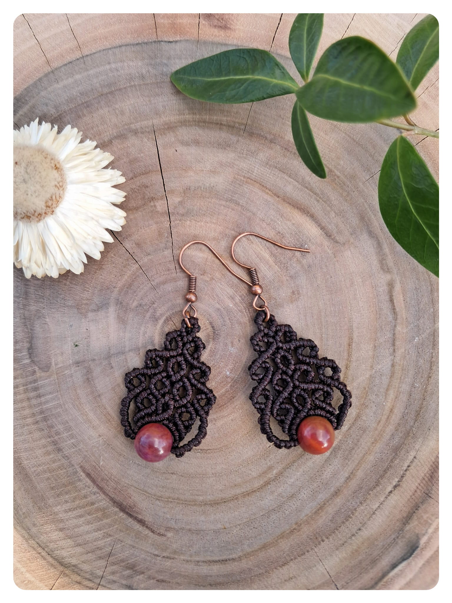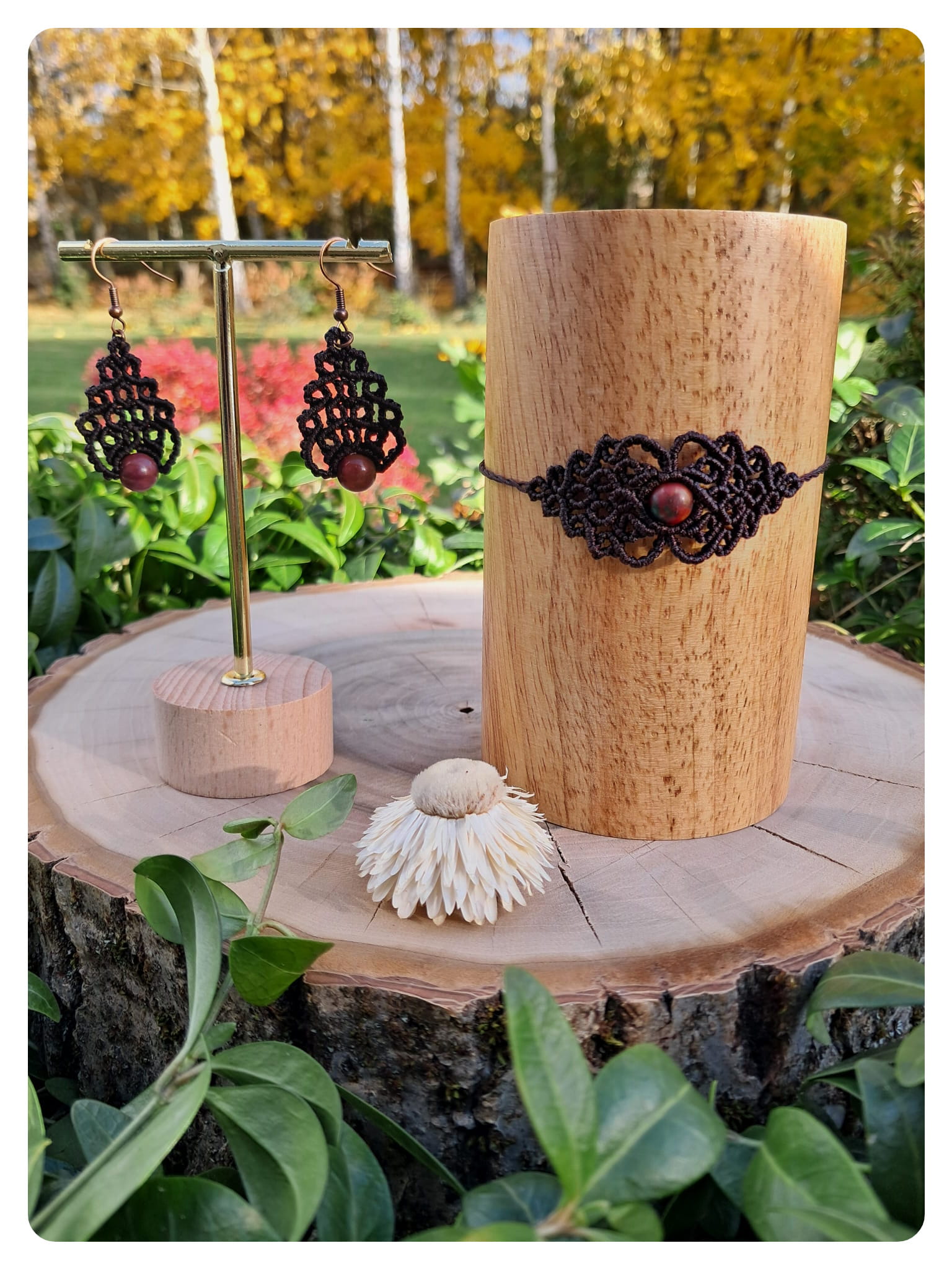 Odkryj wyjątkową elegancję ręcznie wykonanej biżuterii inspirowanej naturą. Ten subtelny komplet składa się z kolczyków oraz bransoletki, wykonanych techniką mikromakramy w kolorze brązowym, ozdobionej naturalnym kamieniem sugilit o intensywnie fioletowo-bordowym odcieniu.