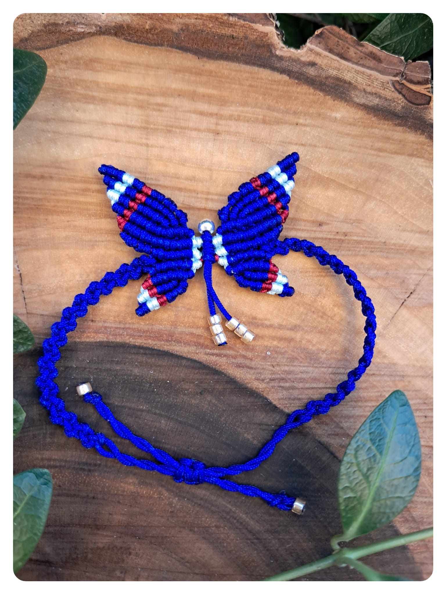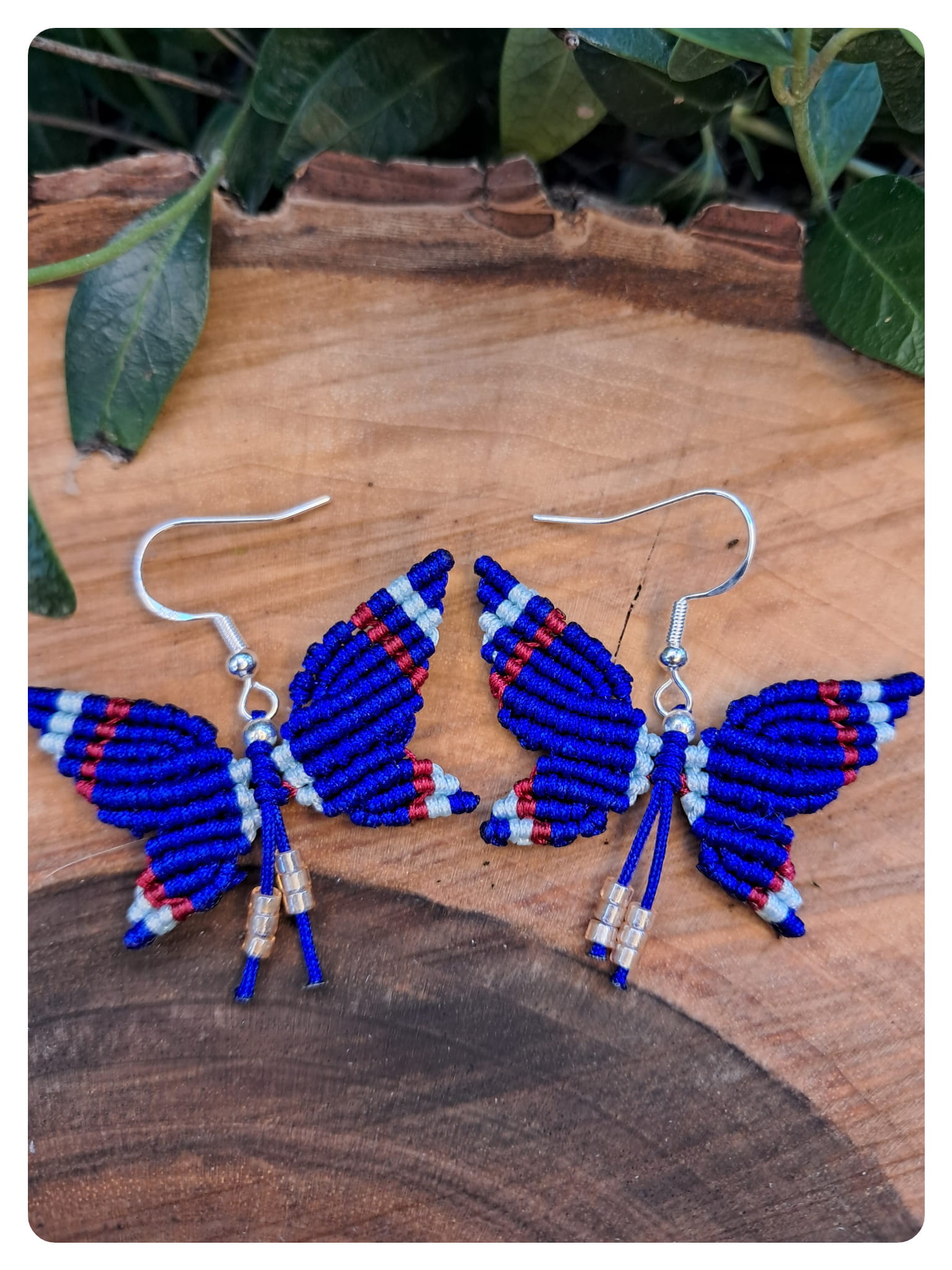 Całość została wykonana z sznurka w intensywnym, kobaltowym odcieniu niebieskiego, z dodatkami błękitnego i czerwonego koloru, co tworzy efektowny, kontrastowy wzór. Skrzydła motyli są misternie splecione, z zachowaniem symetrii i precyzyjnych przejść kolorystycznych.