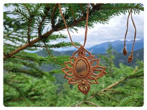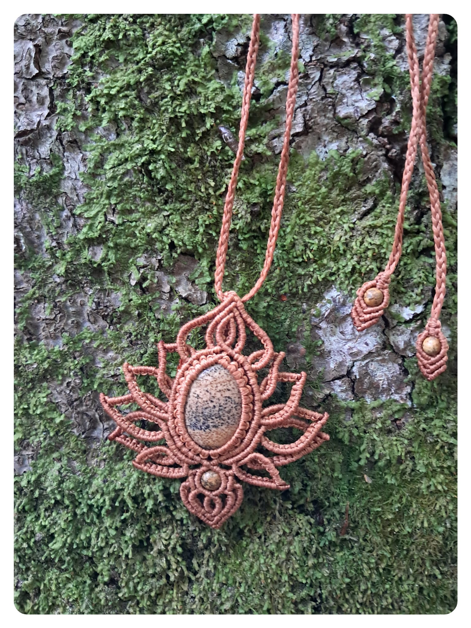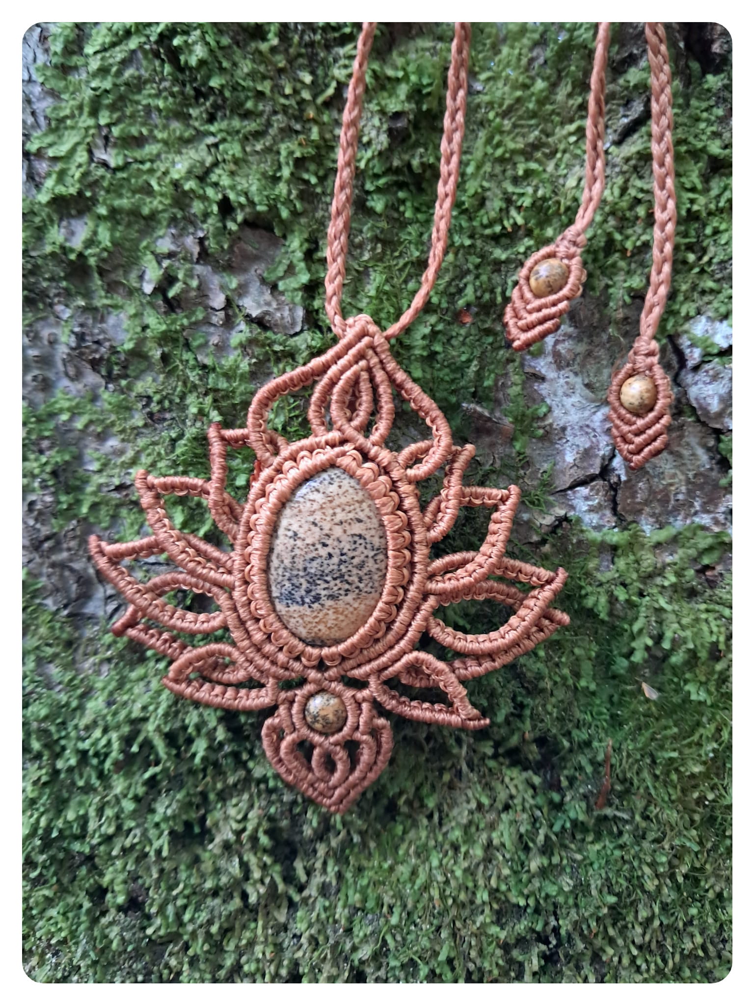 W centrum znajduje się naturalny kamień w odcieniach beżu i brązu, opleciony precyzyjnymi splotami woskowanej nici. Całość tworzy kształt przypominający kwiat lotosu lub mandalę, co nadaje mu harmonijny i etniczny charakter.