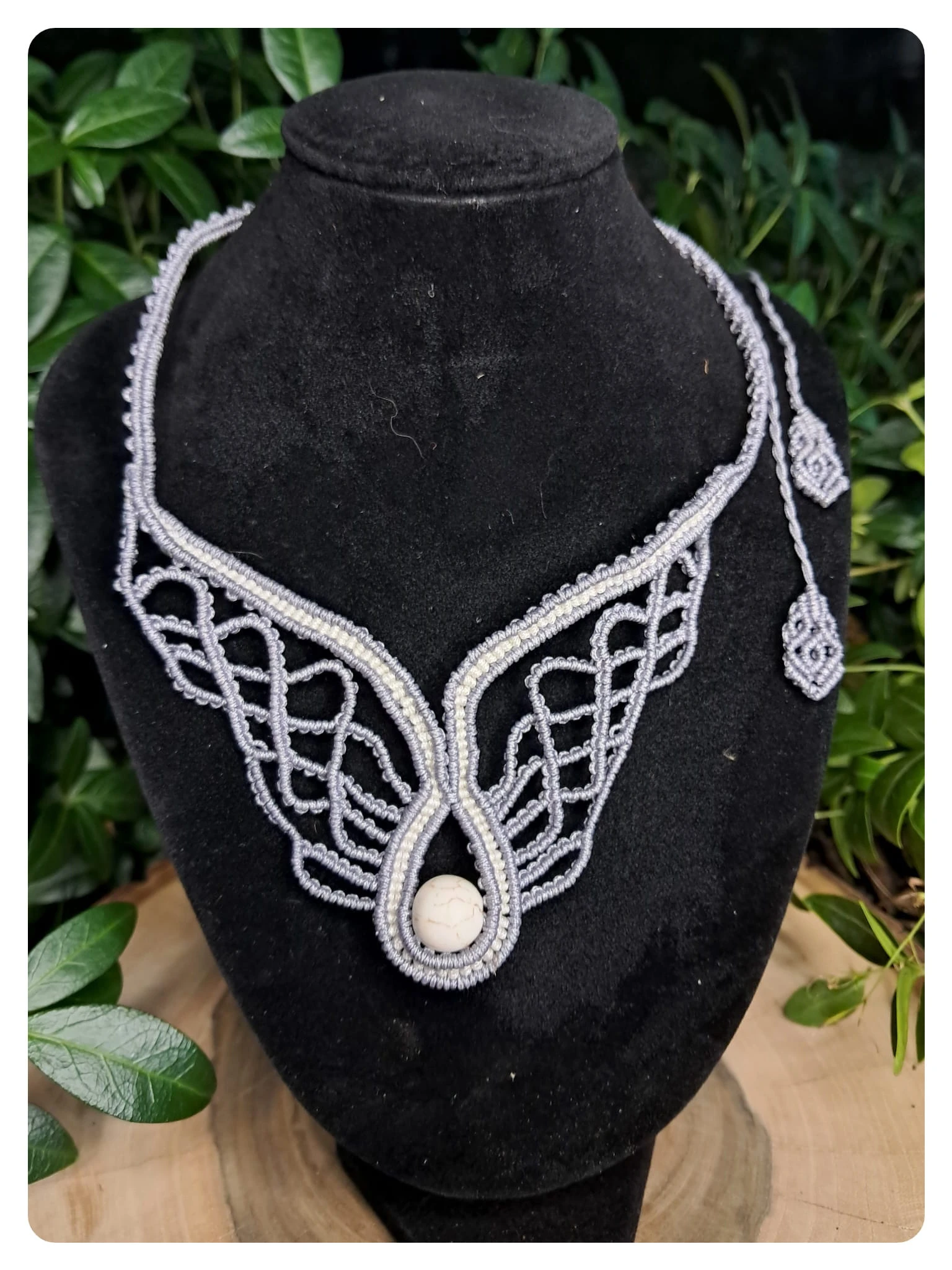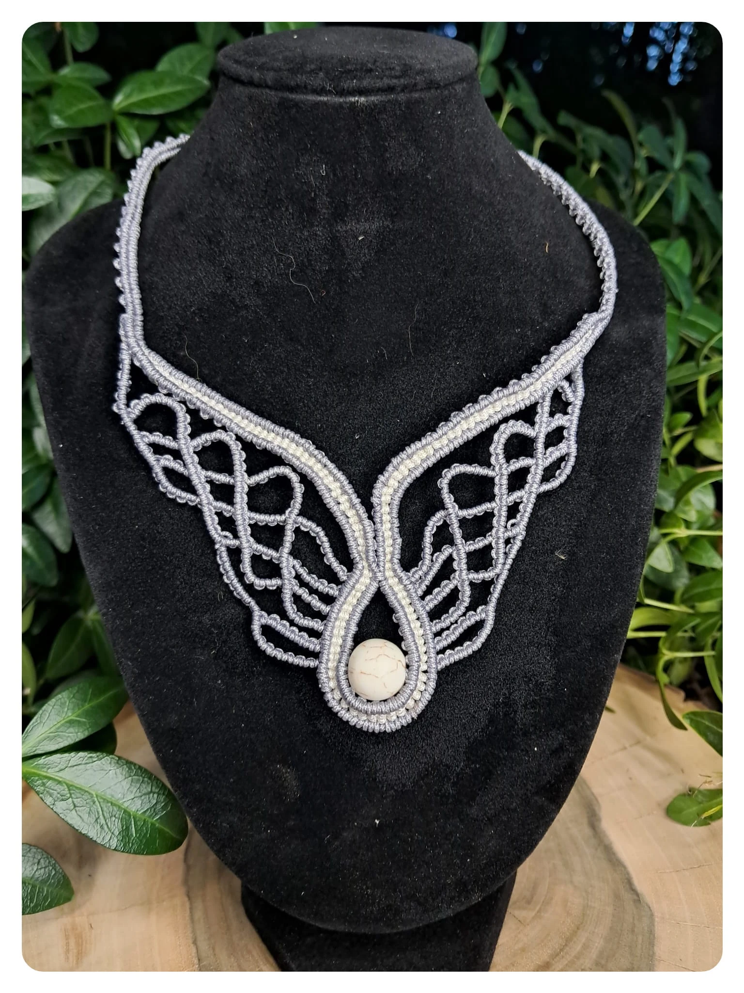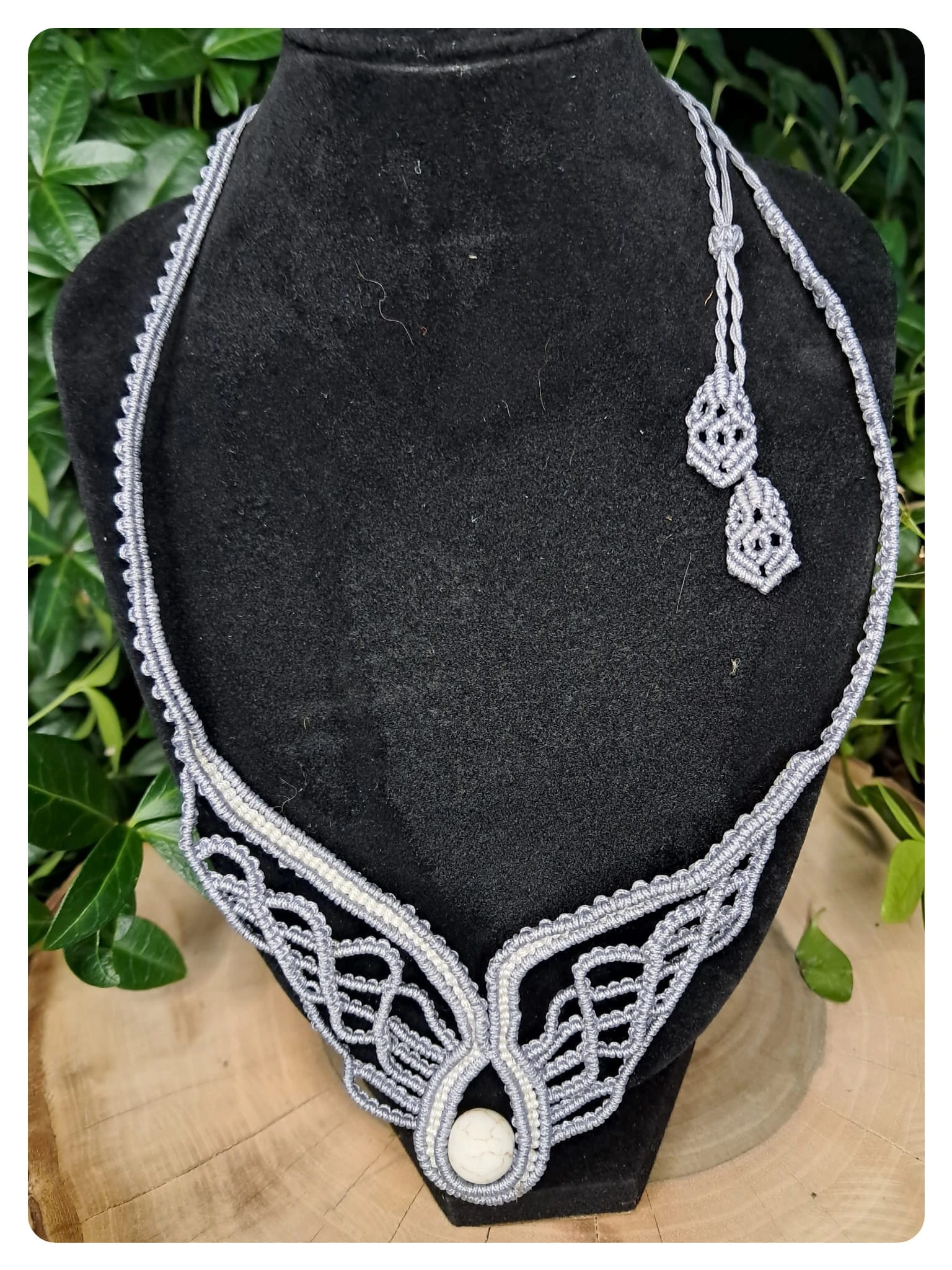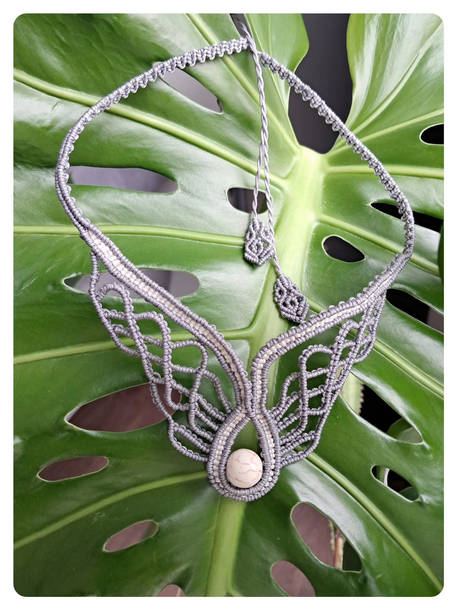 W centrum kompozycji umieszczony został naturalny biały howlit – kamień o subtelnym, marmurkowym wzorze w odcieniach bieli i szarości. Howlit uznawany jest za minerał przynoszący spokój, wyciszenie i równowagę wewnętrzną, dlatego idealnie dopełnia anielską symbolikę naszyjnika.