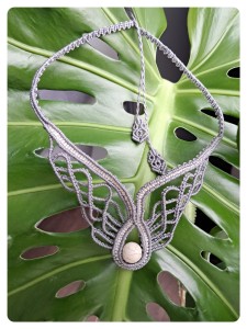 Naszyjnik wykonany techniką mikromakramy w kształcie skrzydeł anioła to wyjątkowa, ręcznie robiona biżuteria o symbolicznym i delikatnym charakterze. Precyzyjne sploty cienkich sznurków tworzą formę przypominającą rozpostarte skrzydła, które kojarzą się z ochroną, lekkością i duchowością.