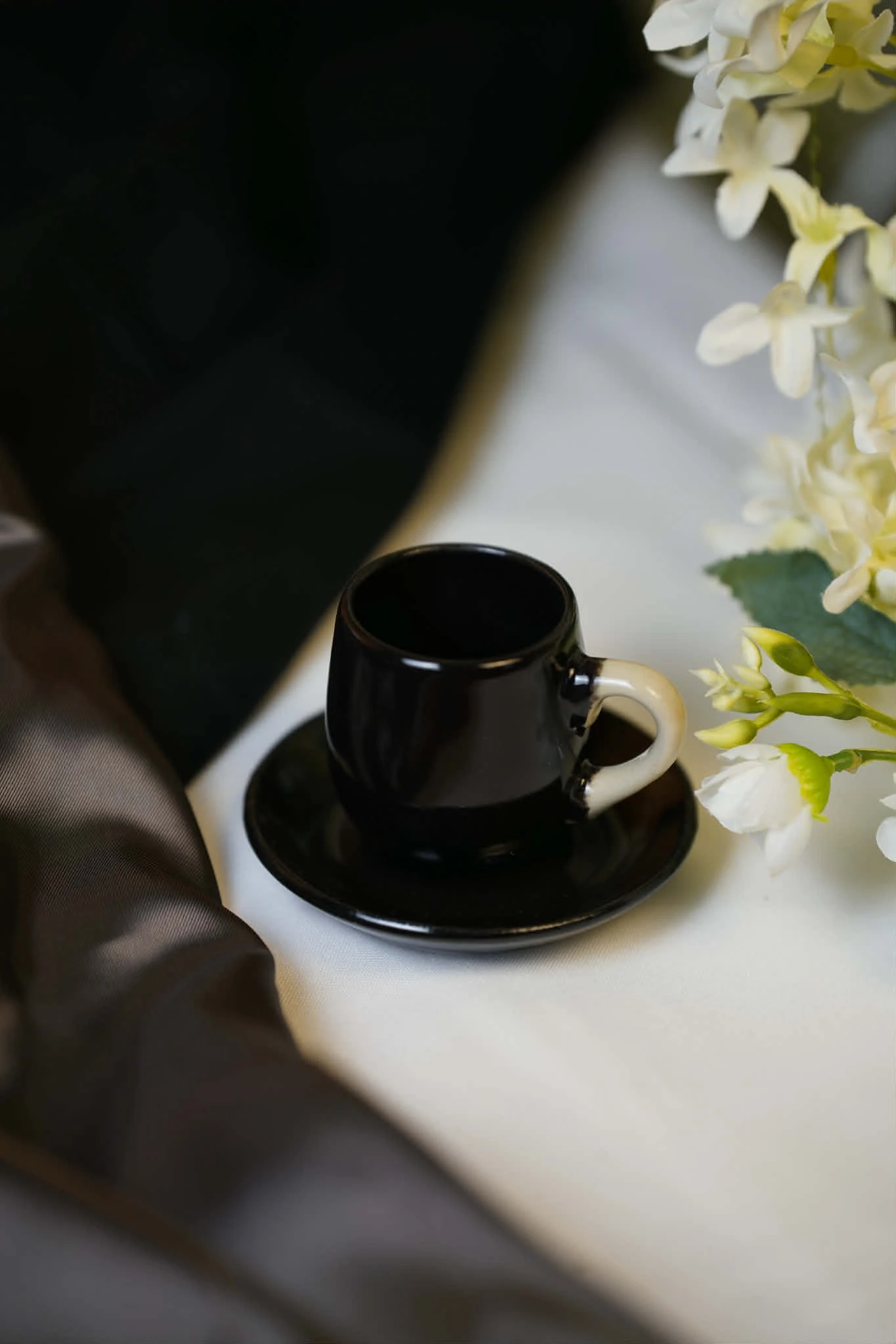 Zestaw 'Nero' składa się z małej, precyzyjnie wykonanej filiżanki do espresso (typu demitasse) oraz dopasowanego spodka. Największym atutem tego zestawu jest uderzający kontrast kolorystyczny: głęboka, błyszcząca czerń (włoskie nero) korpusu i spodka pięknie odbija światło, tworząc eleganckie refleksy.