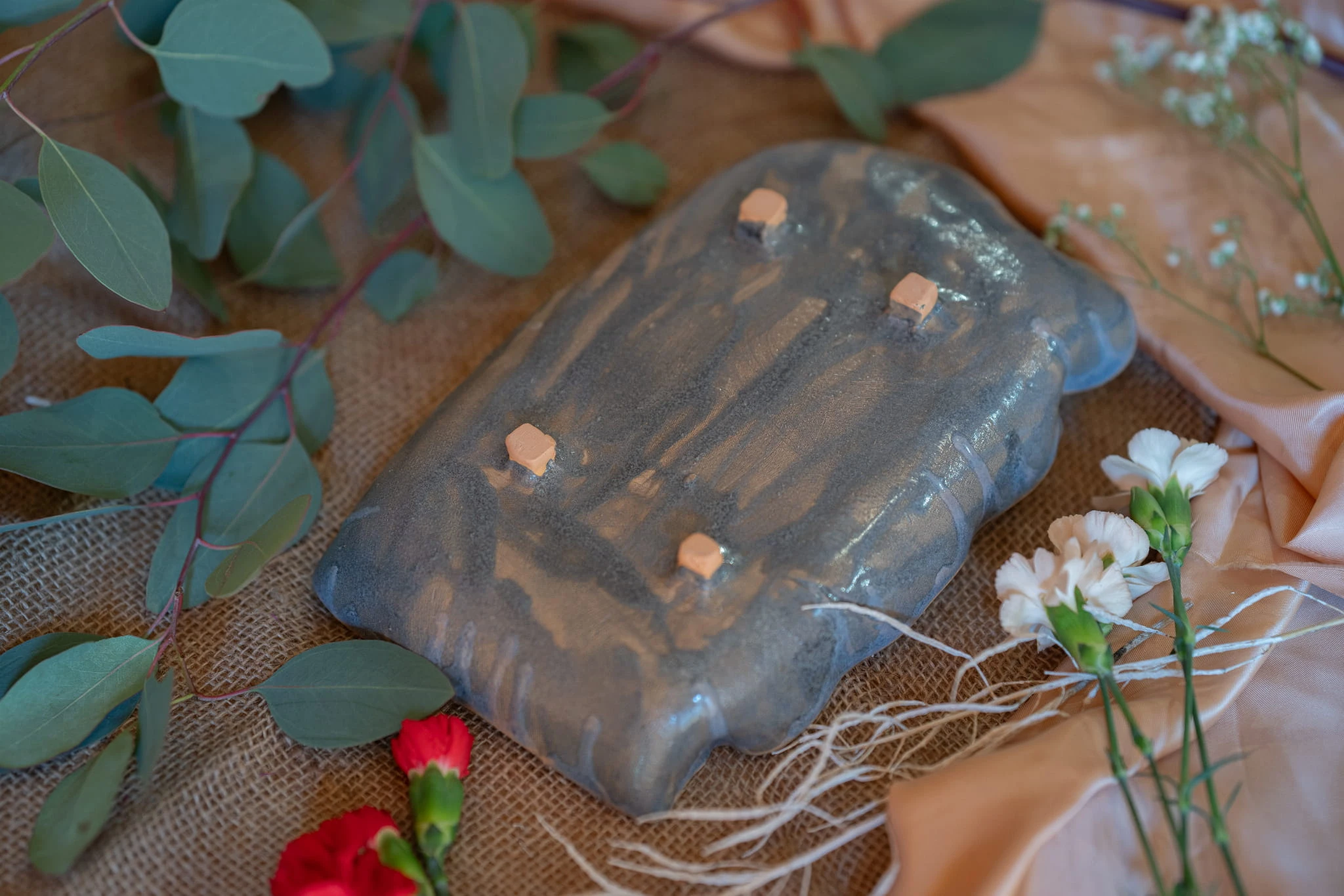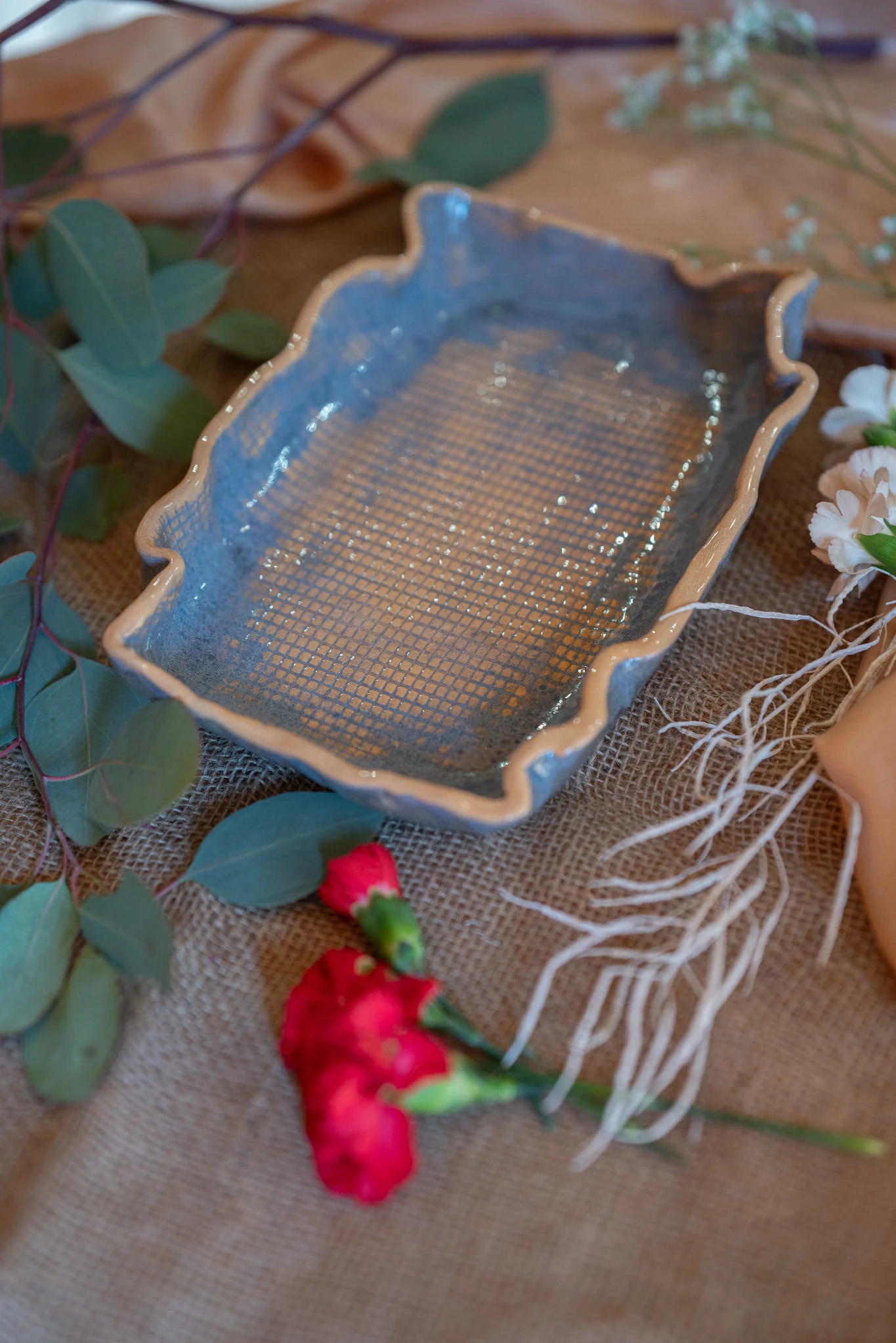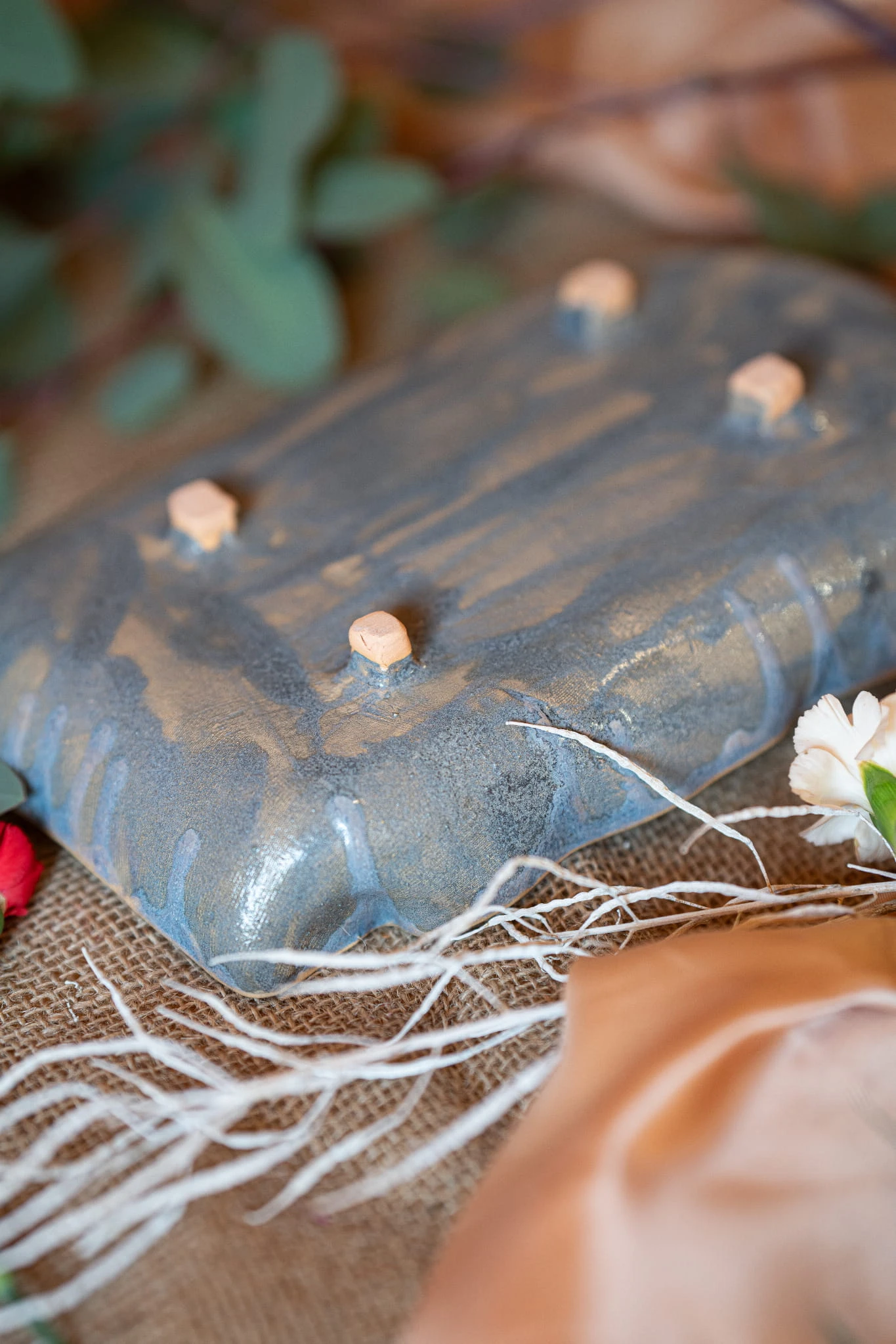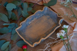Paterę wykonałam ręcznie. Szkliwo nałożyłam pędzlem, dlatego jest rozłożone nierównomiernie, zwłaszcza pod spodem patery. Ten efekt sprawia, że produkt jest niepowtarzalny.