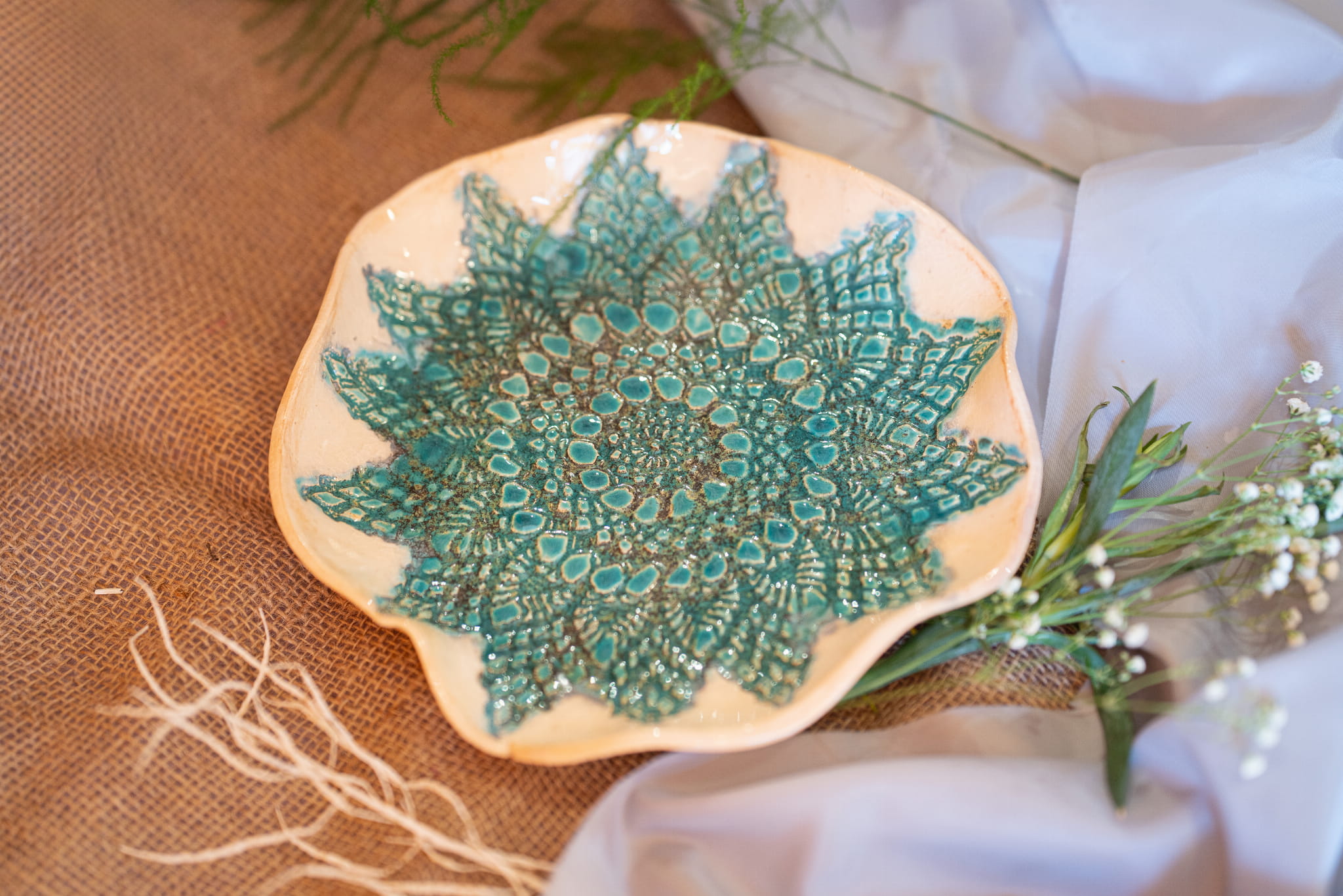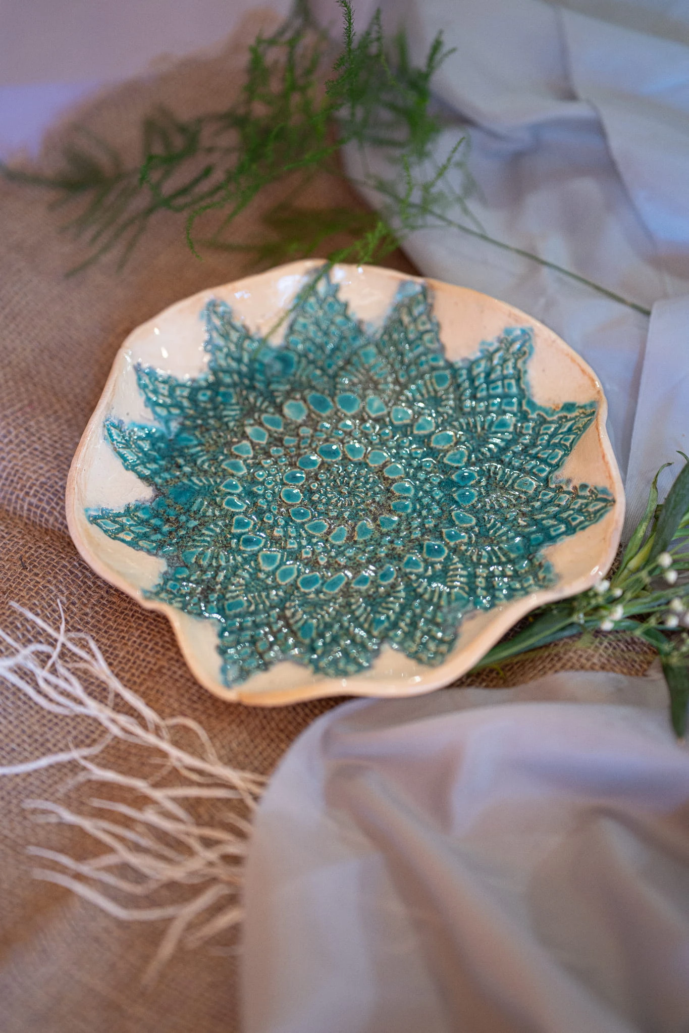 Paterę wykonałam ręcznie, dzięki czemu jest niepowtarzalna. Posiada piękne mozaikowe zdobienie w kolorze turkusowym.