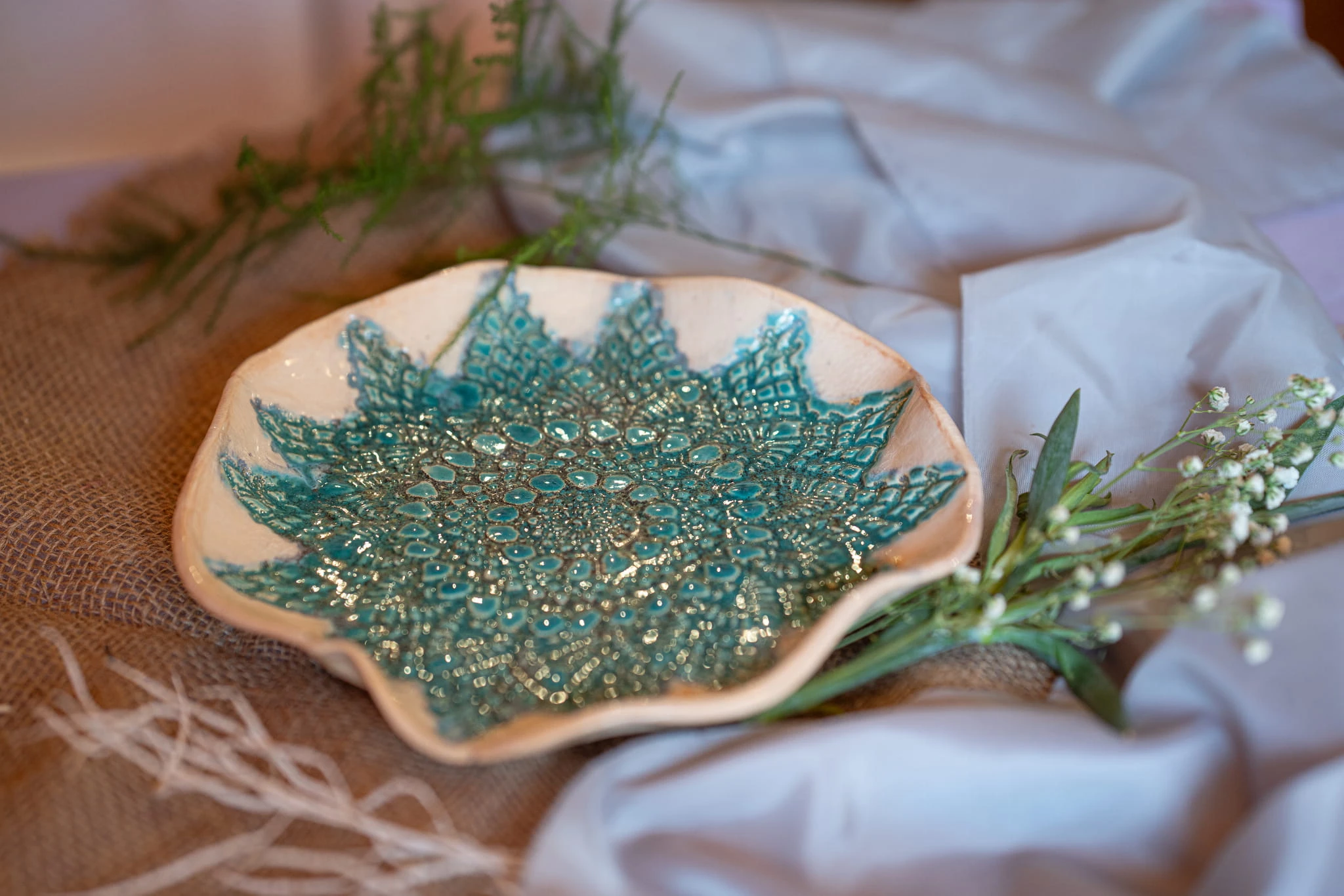 Patera Turkusowe Szaleństwo na nóżkach ma ok. 25 cm średnicy i 4,5 cm wysokości.