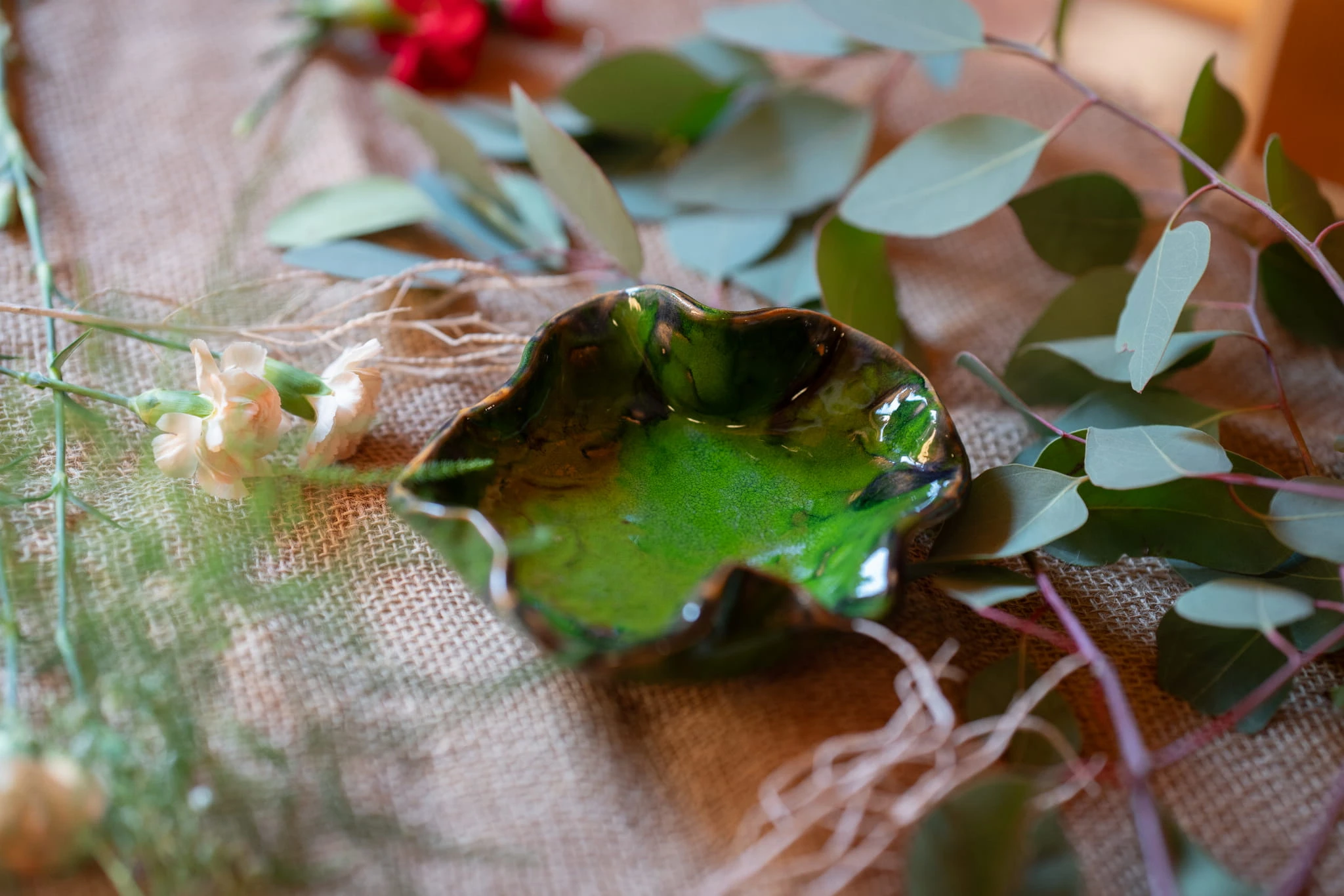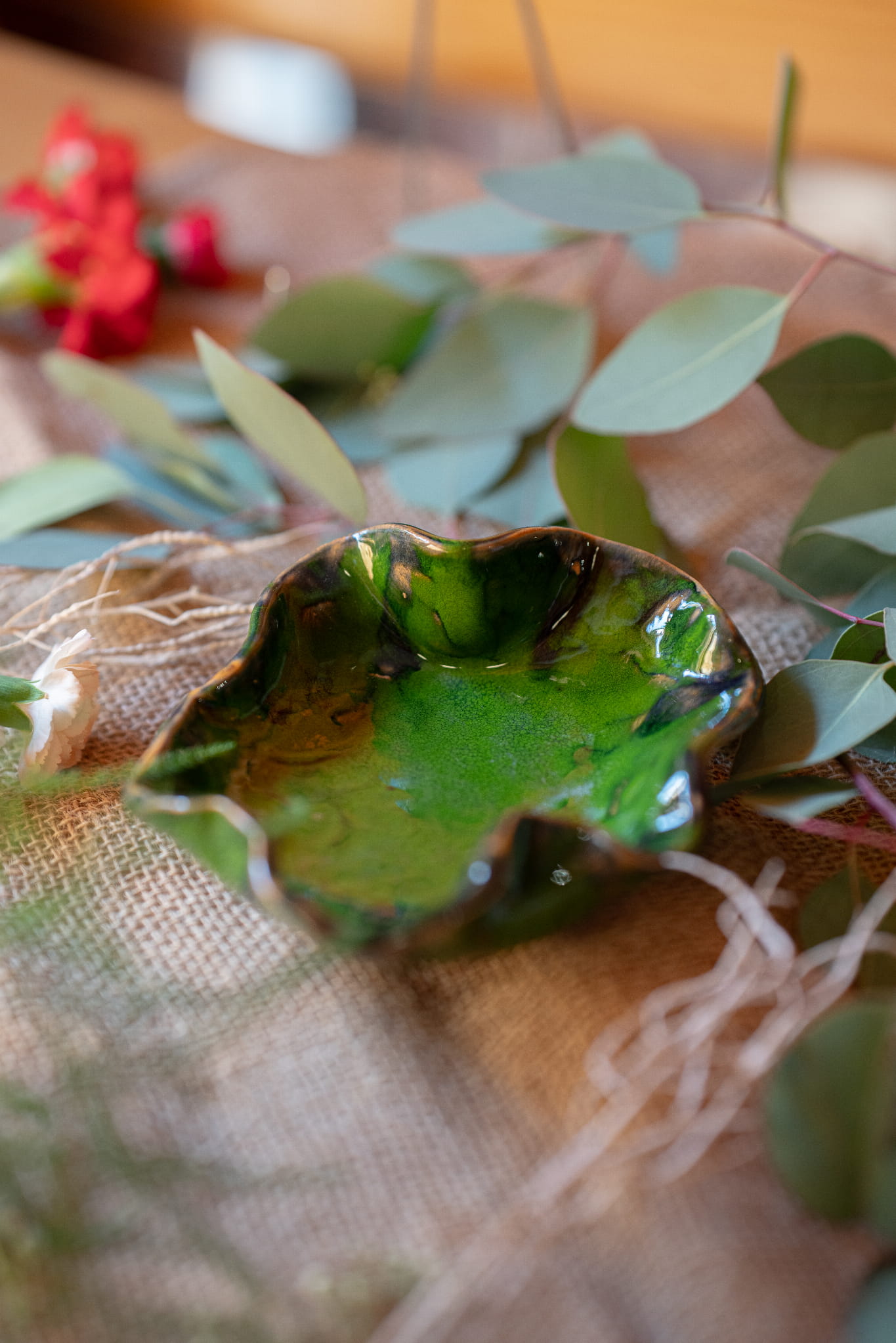 Paterę wykonałam ręcznie. Jej obrys jest falisty, w kształcie przypomina owal. Patera jest pokryta intensywnym zielonym szkliwem z subtelnymi ciemnymi zaciekami dla pokreślenia jej kształtu. Dzięki nóżkom zyskuje na wysokości, świetnie sprawdzi się jako element zastawy stołowej, jak i element wystroju wnętrza.