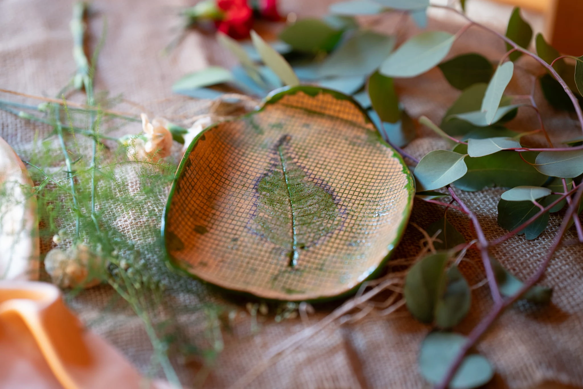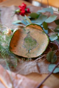 Paterę uformowałam własnoręcznie. Odcisnęłam na niej drobną siatkę i liścia. Pod spodem jest zielona, w kolorze który znajduje się na jej górnej krawędzi. Patera ma nieregularny obrys, zbliżony do trójkąta.