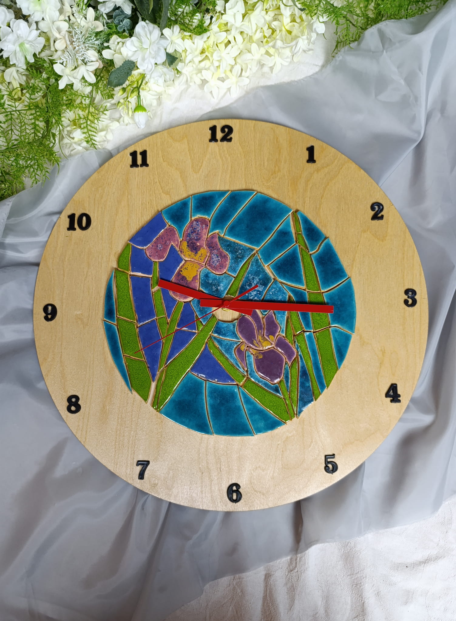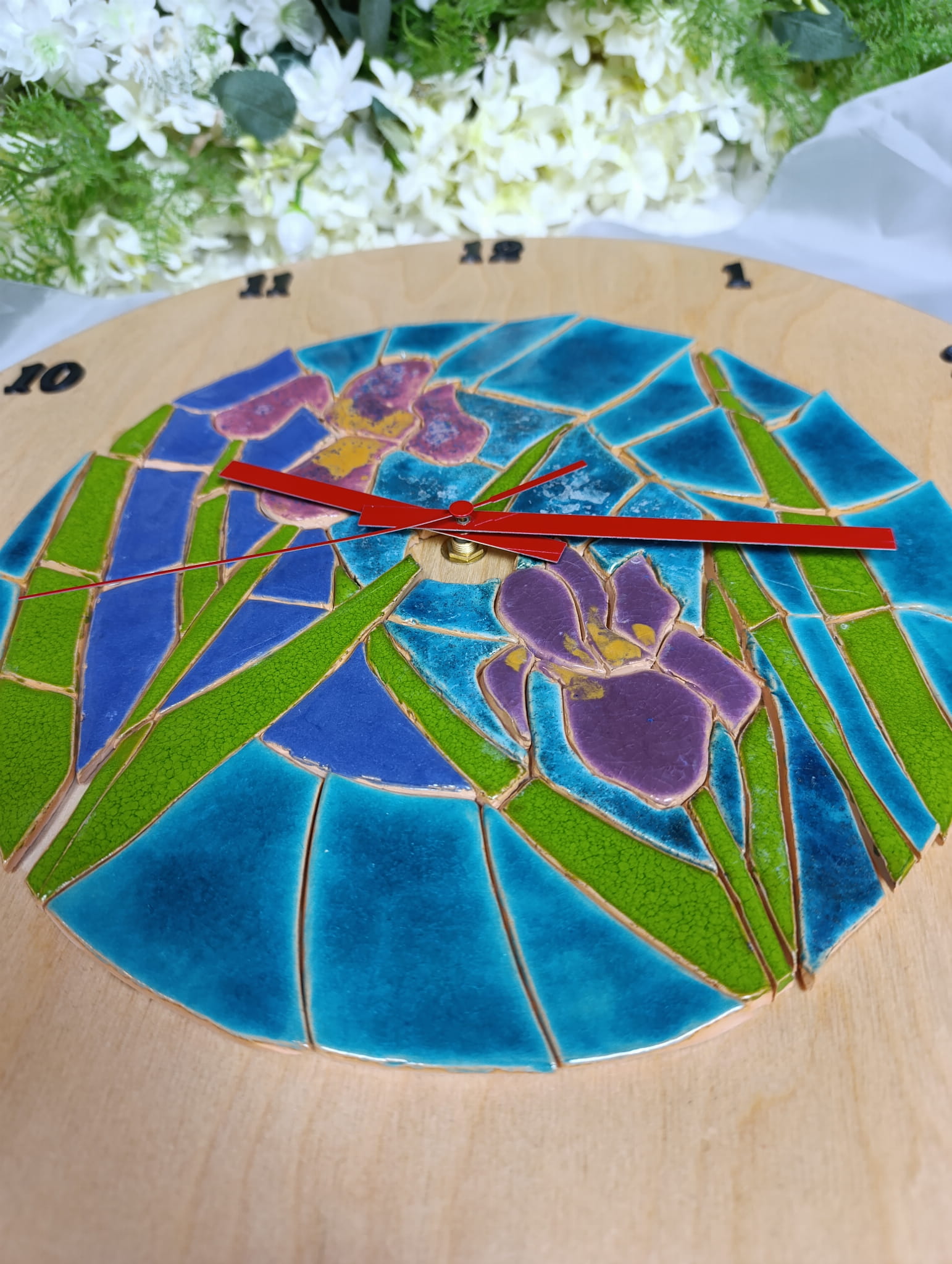 Zegar wykonałam własnoręcznie. Do tarczy przytwierdzona jest mozaika ceramiczna z motywem irysów.