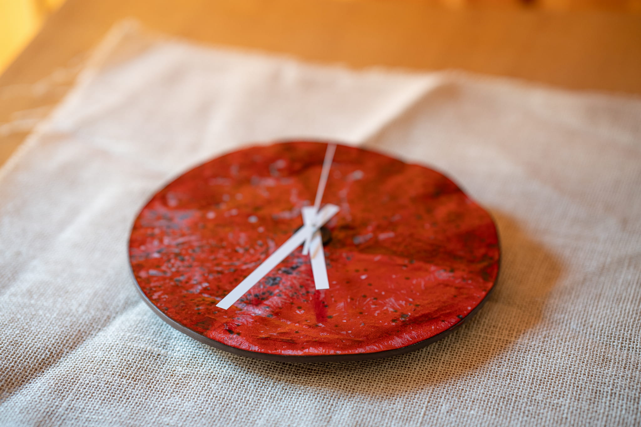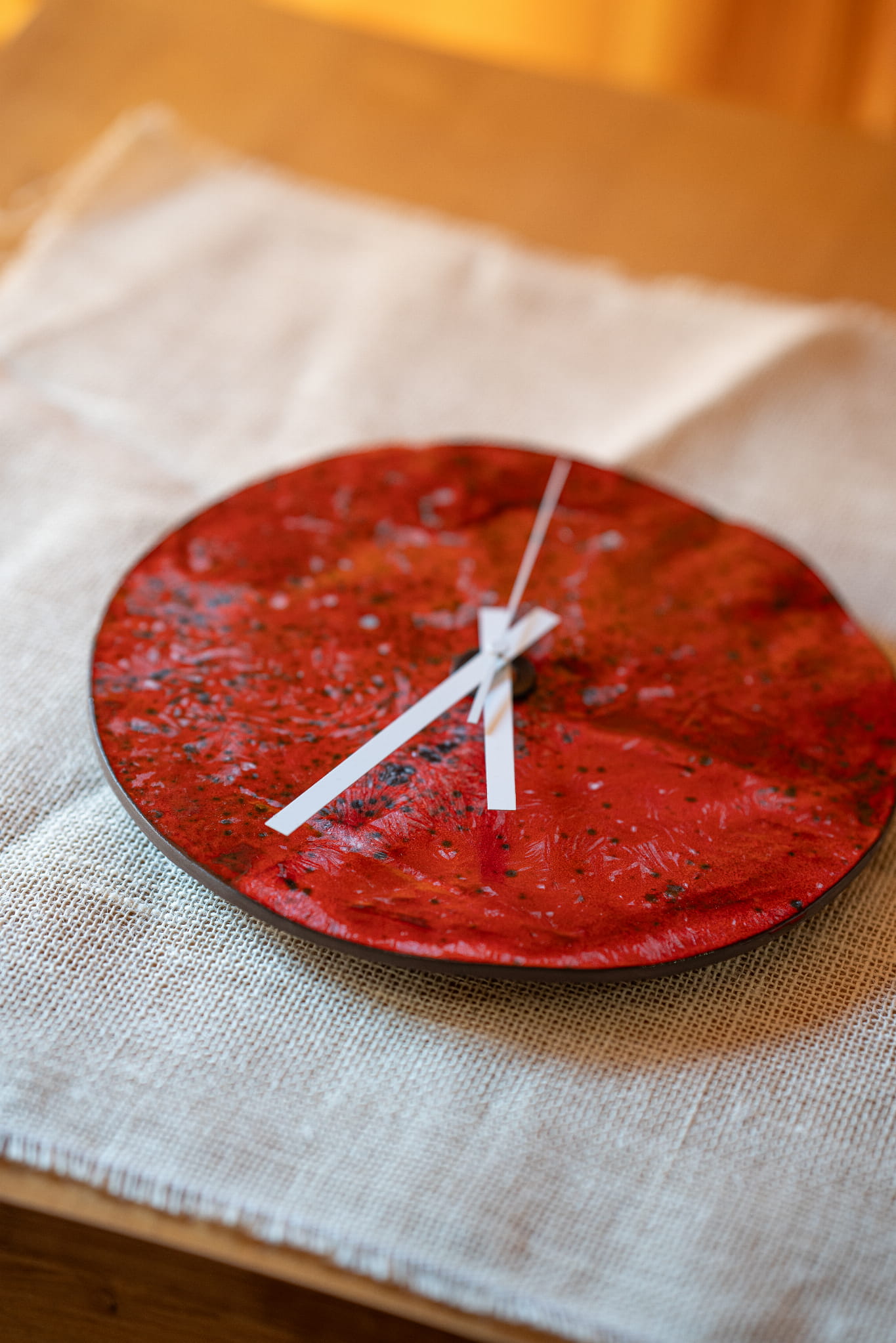 Zegar Volcano wykonałam własnoręcznie. Jest idealnym wyborem dla tych, którzy nie lubią oczywistych, regularnych kształtów. Posiada czerwone szkliwo z czarnymi wtrętami oraz białe proste wskazówki. Świetnie sprawdzi się w rustykalnych wnętrzach.